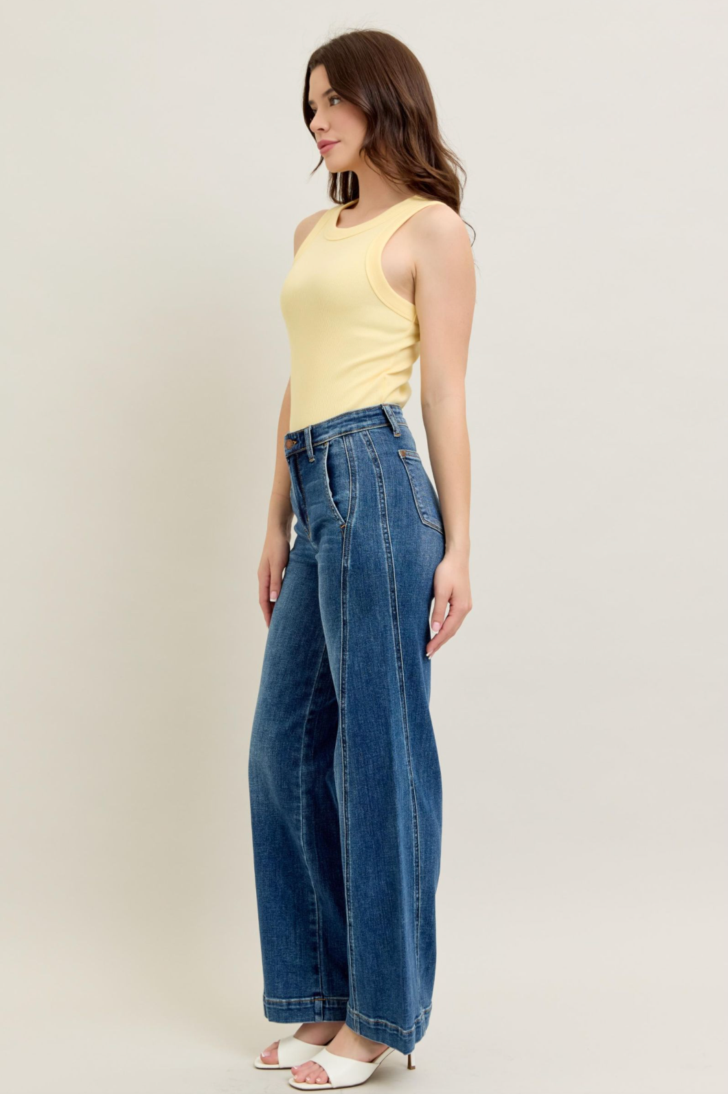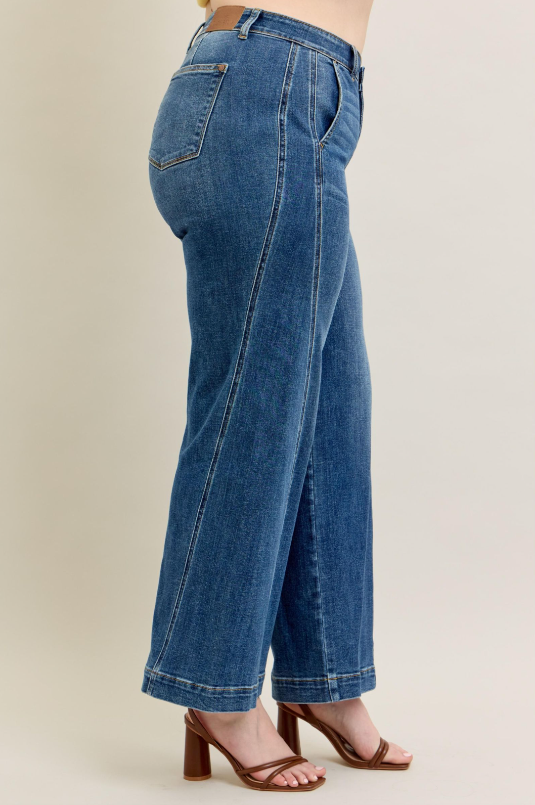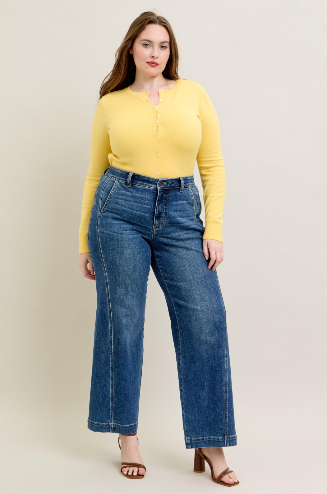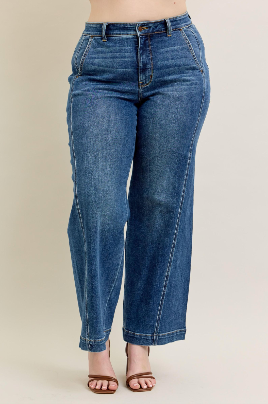 Elevate your denim game with these HW Trouser Wide Leg Jeans, blending timeless sophistication with a modern edge. Featuring angled front pockets for effortless access and a distinctive side-to-front hem detail that wraps around the leg, these jeans deliver an unexpected design twist. The hemmed bottom creates a polished, intentional finish perfect for styling with everything from sneakers to heels.