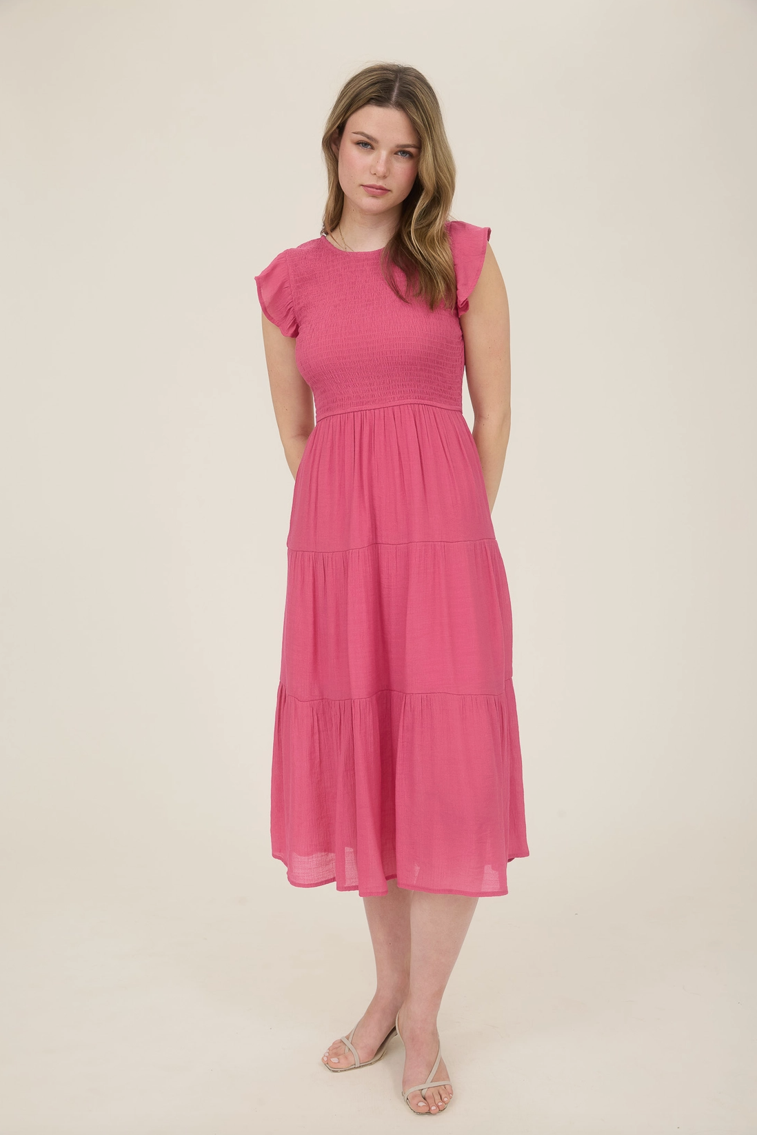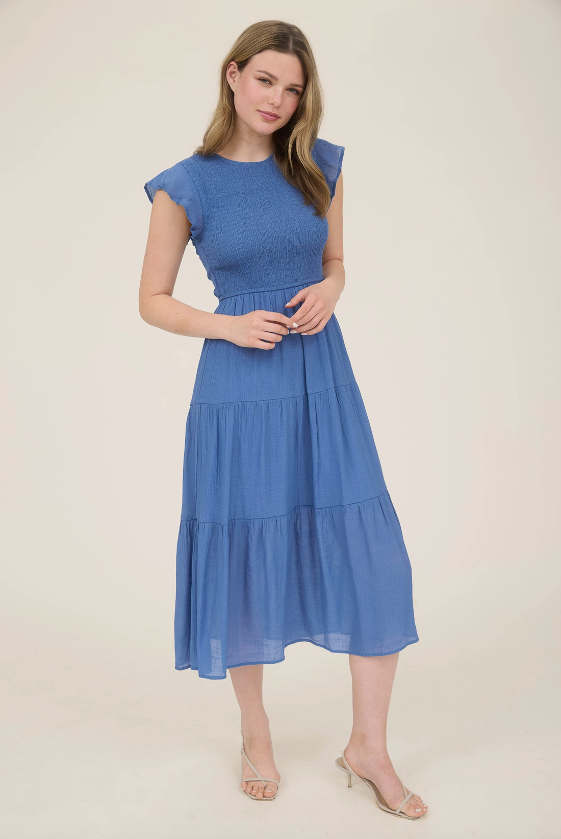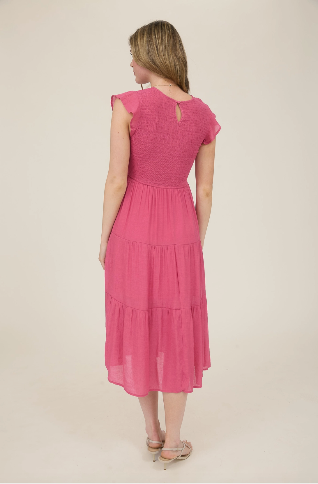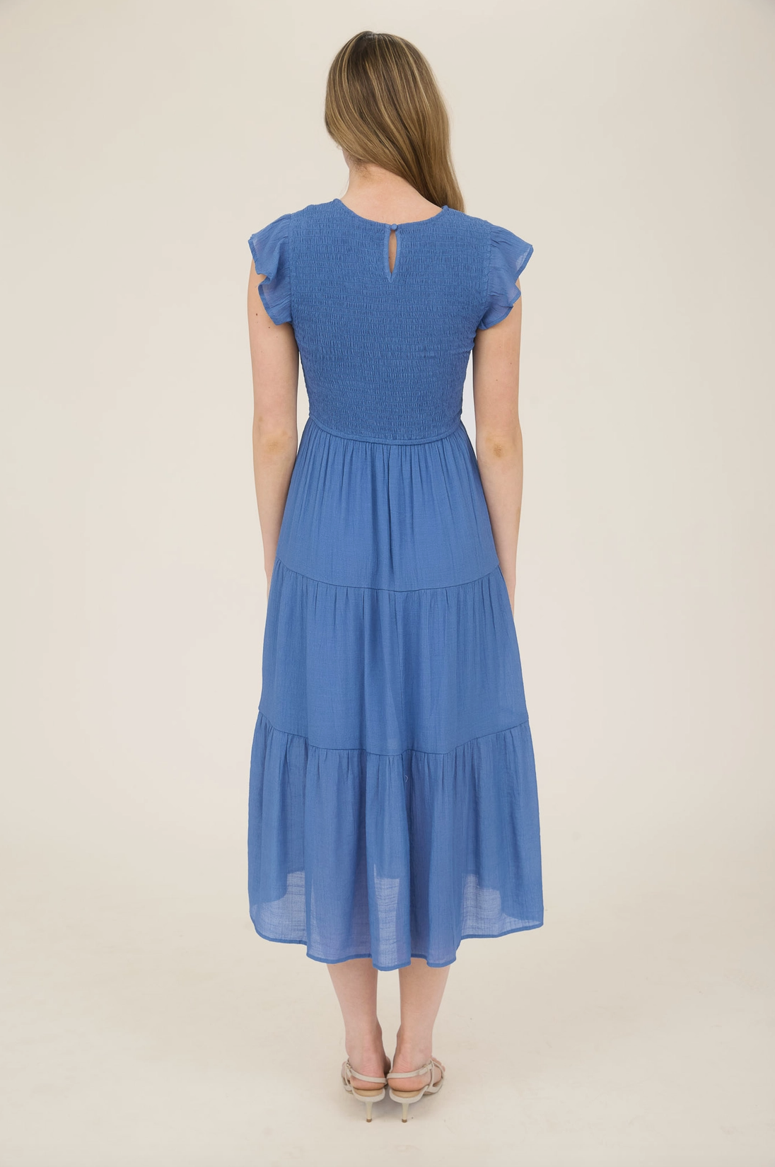 Easy, flattering, and full of charm. This midi dress features a round neckline with a keyhole button detail, cap sleeves, a comfy smocked bodice, and a breezy tiered skirt, perfect for everyday wear or casual outings.