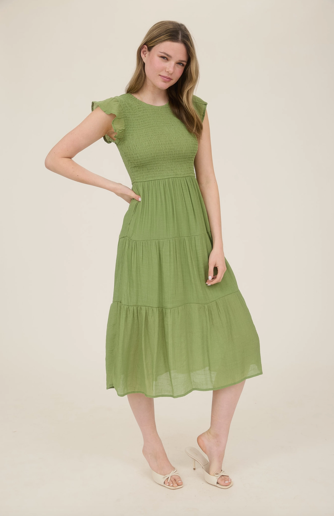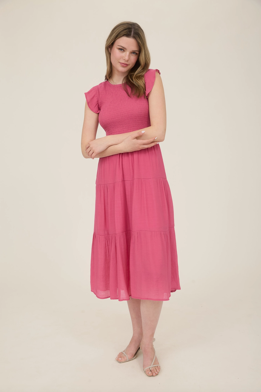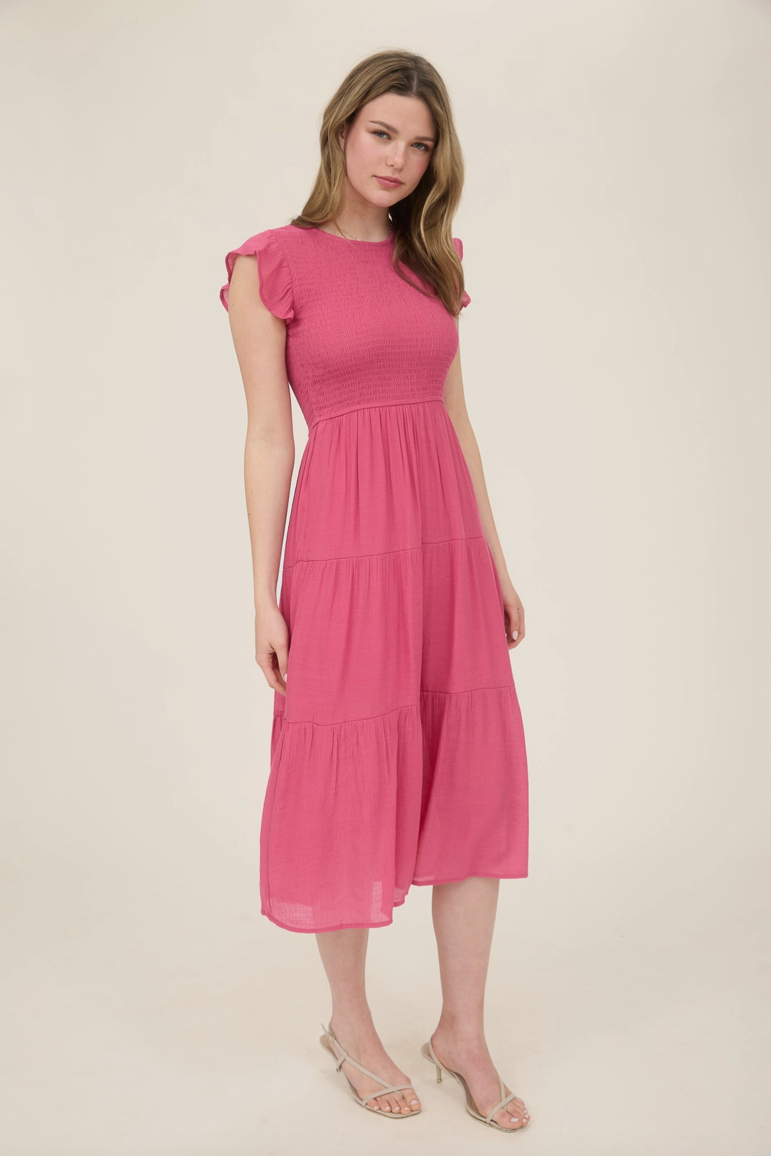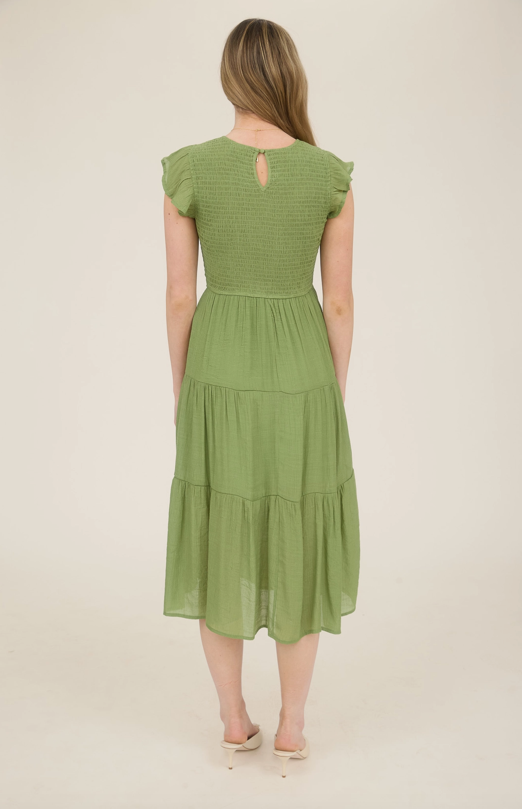 Easy, flattering, and full of charm. This midi dress features a round neckline with a keyhole button detail, cap sleeves, a comfy smocked bodice, and a breezy tiered skirt, perfect for everyday wear or casual outings.
