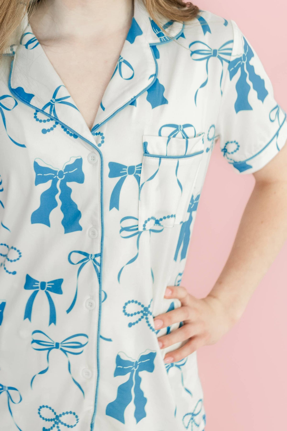 This pajama set is made from a super soft fabric, ensuring a cozy feel for lounging or sleeping. The set includes a short-sleeved, button-up top with a matching pair of shorts. The shorts have a wide elastic waistband and handy pockets. Playful bows add a touch of sweetness, making this pajama set perfect for lounging in style and snuggling up with a good book.
