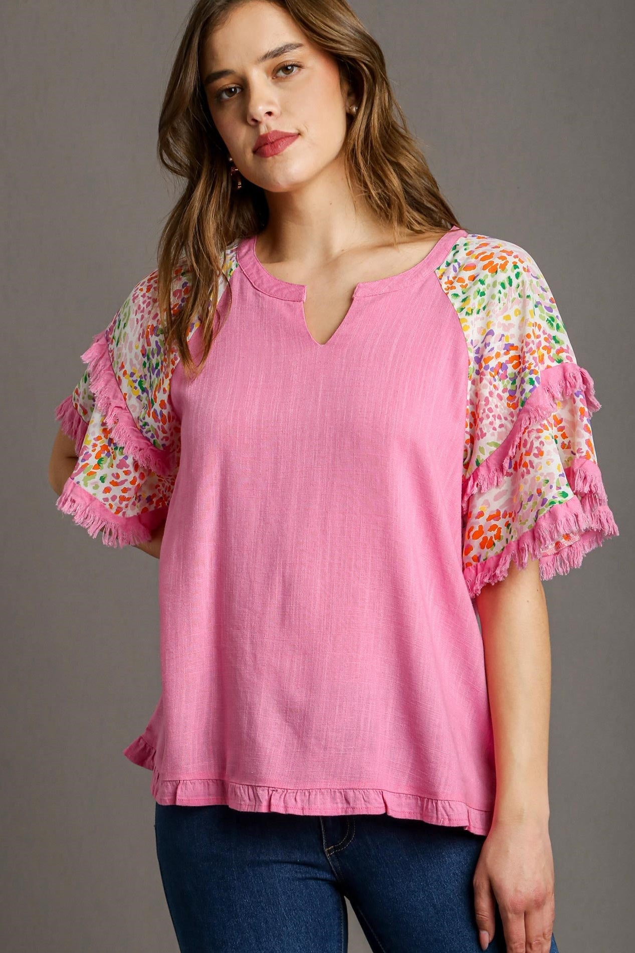 Add a wild twist to your wardrobe with this Leopard Frayed Sleeve Blouse. Featuring playful ruffle frayed hem sleeves and a flattering V-neck, the pink bodice keeps things fun and feminine. Its loose, flowy fit and breathable fabric make it perfect for all-day comfort and effortless style.