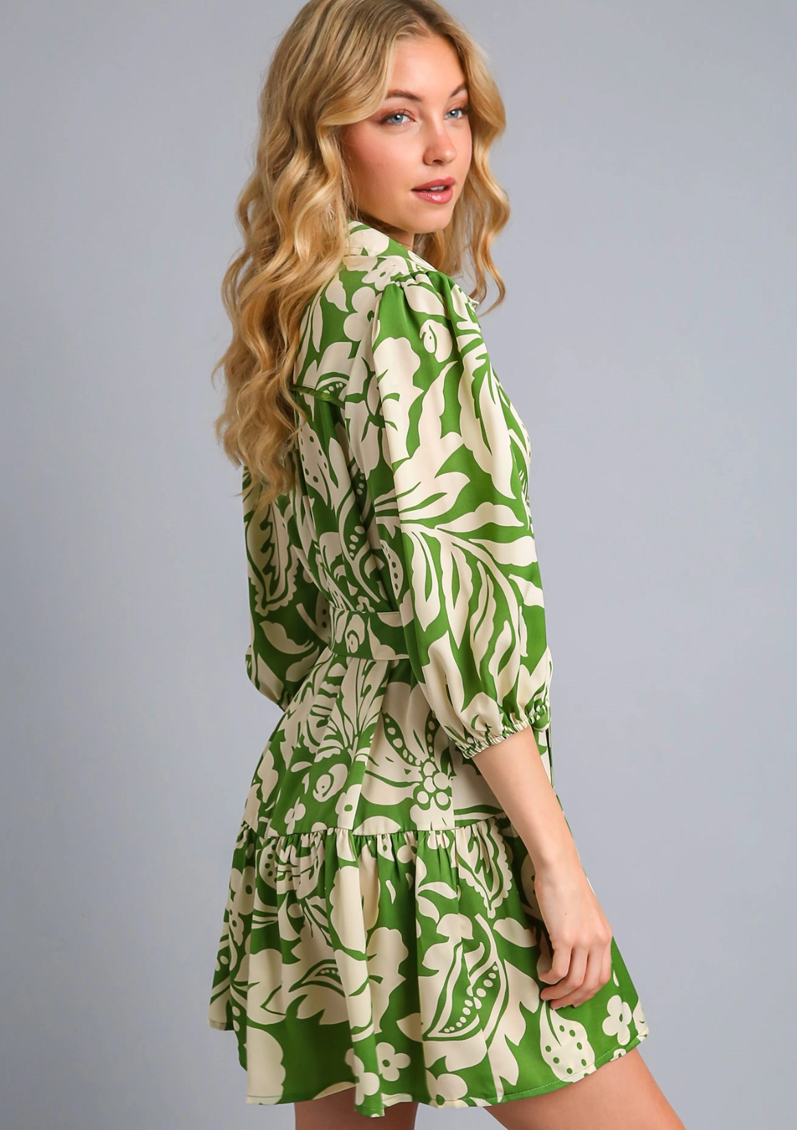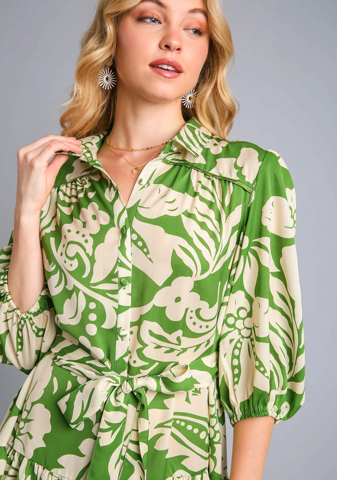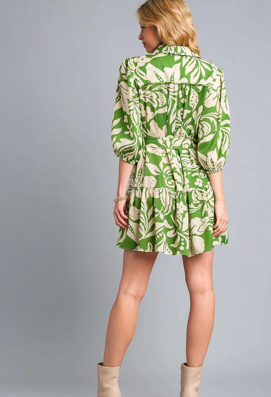 The Green Palm Dress offers a graceful two-tone design adorned with a green leaf floral pattern. Its puffed quarter sleeves and neat collar enhance its charming silhouette, while the adjustable belt defines your waist for a comfortable and flattering fit. This dress brings a soft, natural elegance to your wardrobe, perfect for both casual days and special moments.