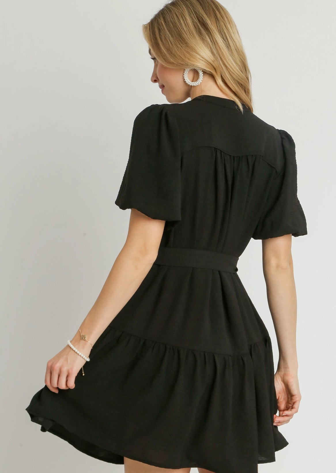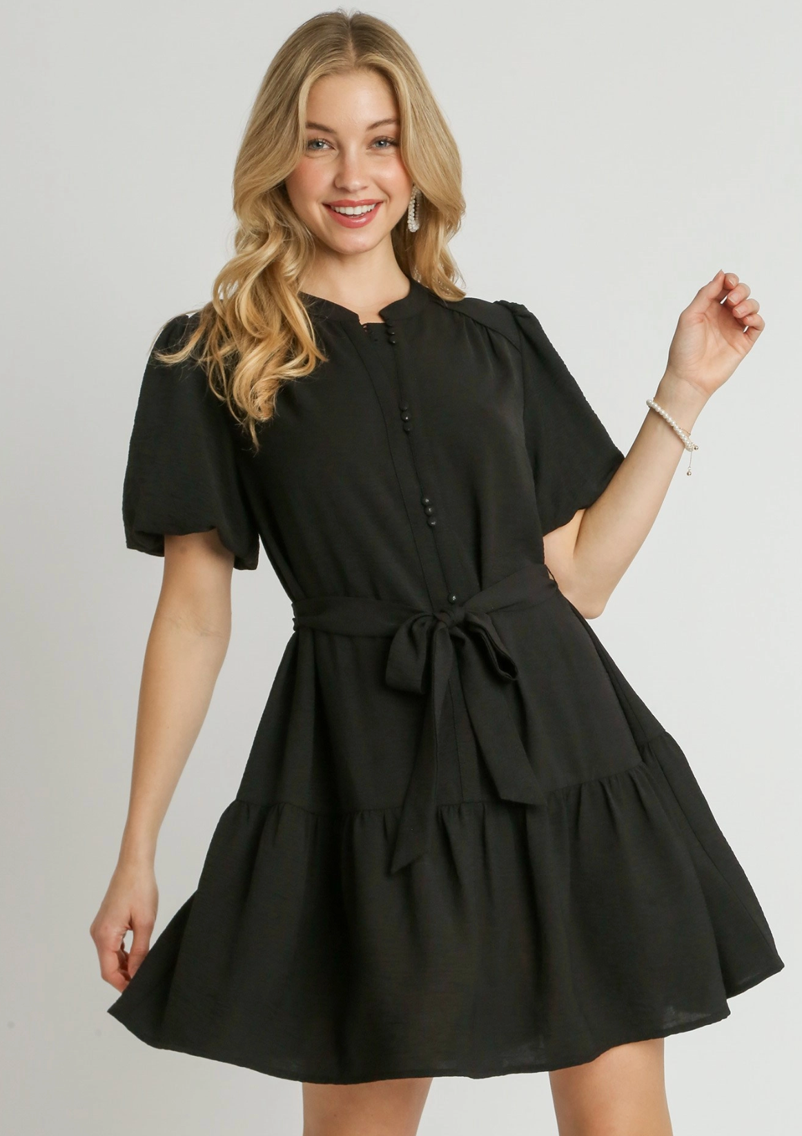 This mini dress combines timeless elegance with modern flair. The gathered button neckline adds sophisticated detail, while pleated accents create dimension and movement. Puff sleeves bring a touch of romance, and the waist tie cinches your silhouette for a flattering, defined look. A versatile piece that works beautifully for brunch, date night, or weekend adventures.