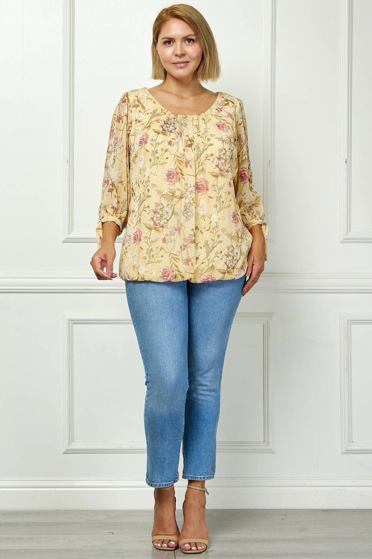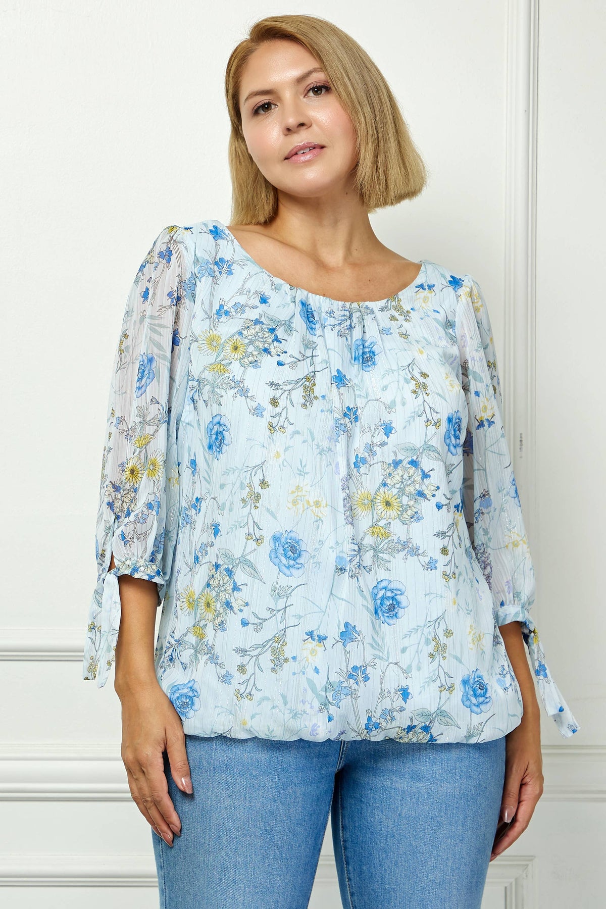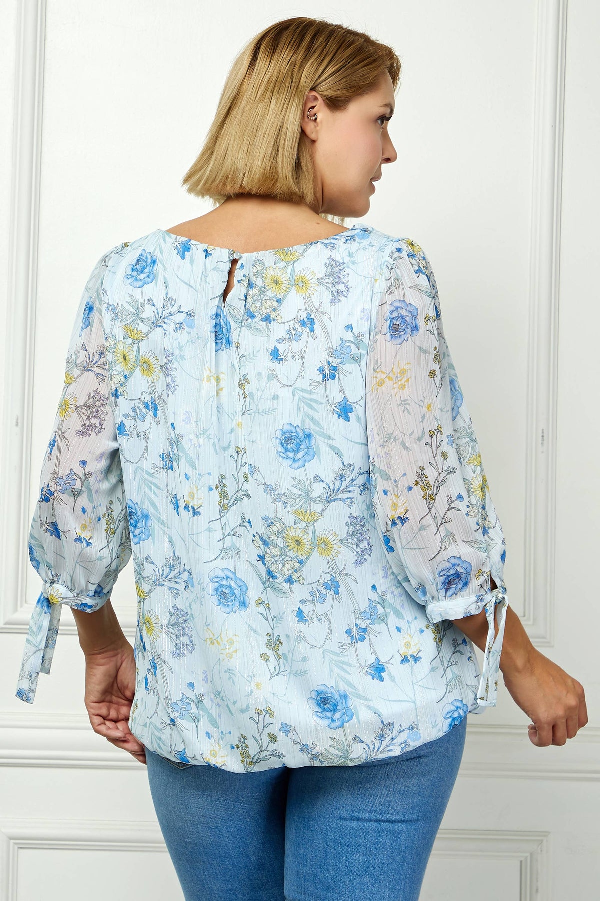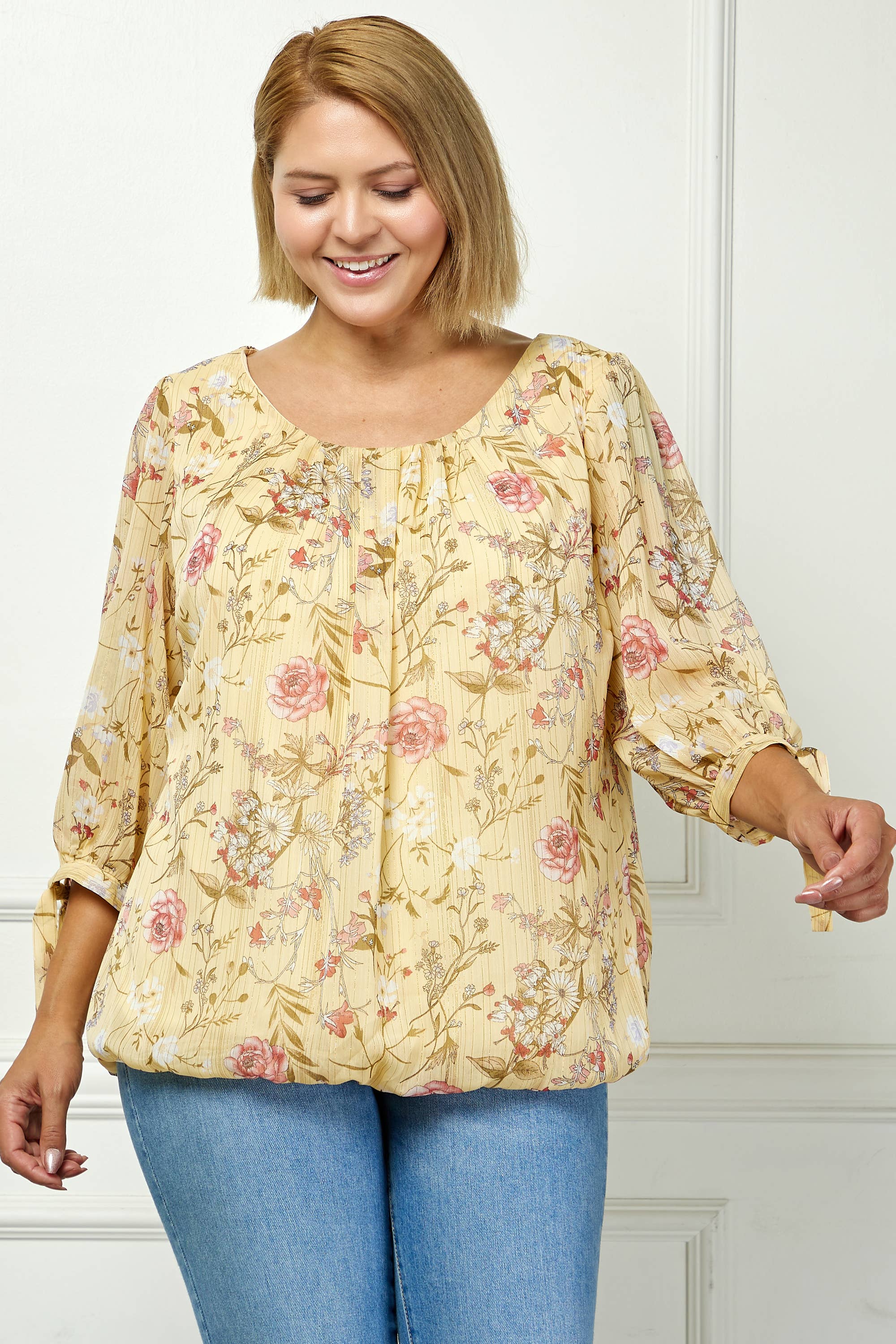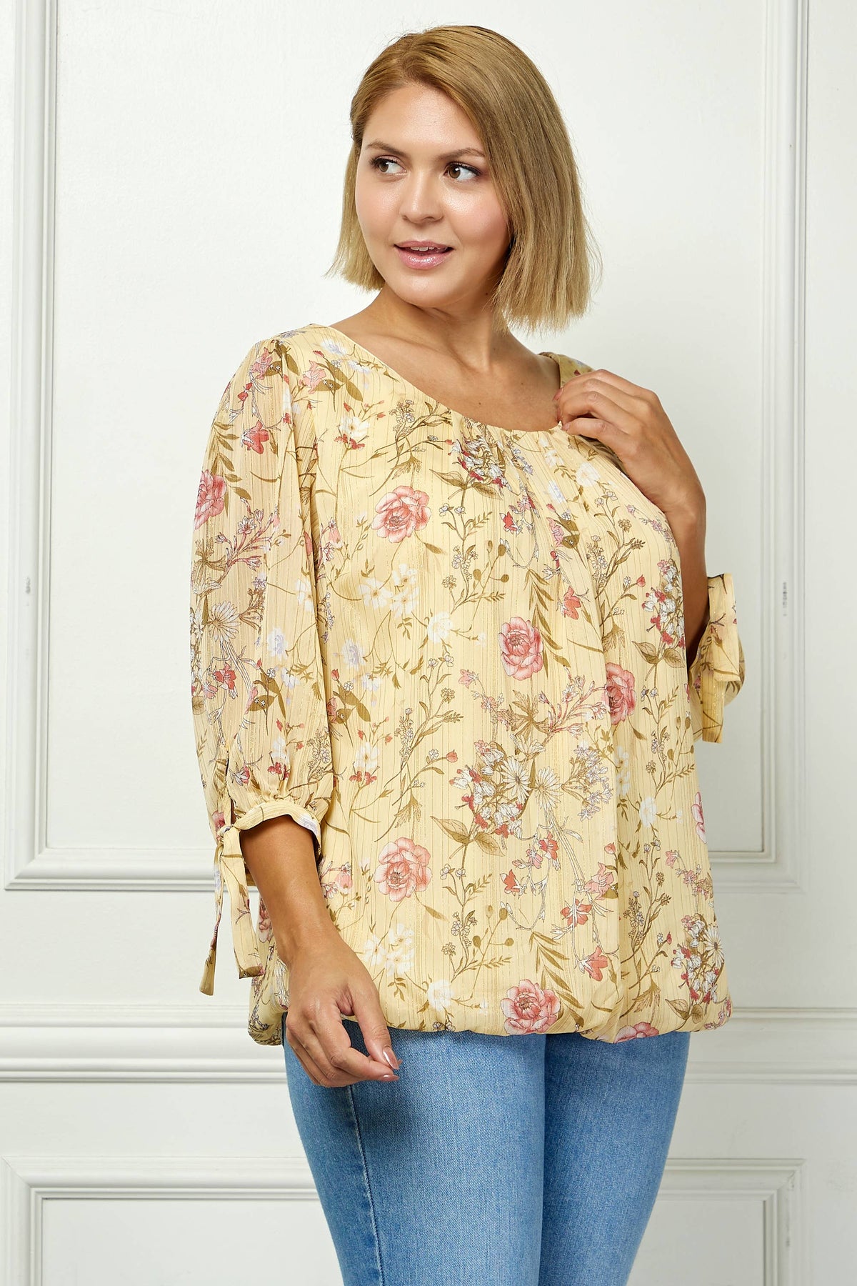 Lightweight chiffon blouse with a soft variegated stripe texture and subtle lurex shimmer. Relaxed silhouette with gathered scoop neckline and 3/4 length sleeves with adjustable self-tie details. Designed for plus sizes to offer comfortable coverage while maintaining an airy, feminine drape. Perfect for weddings, brunches, special occasions, or polished everyday and office styling.