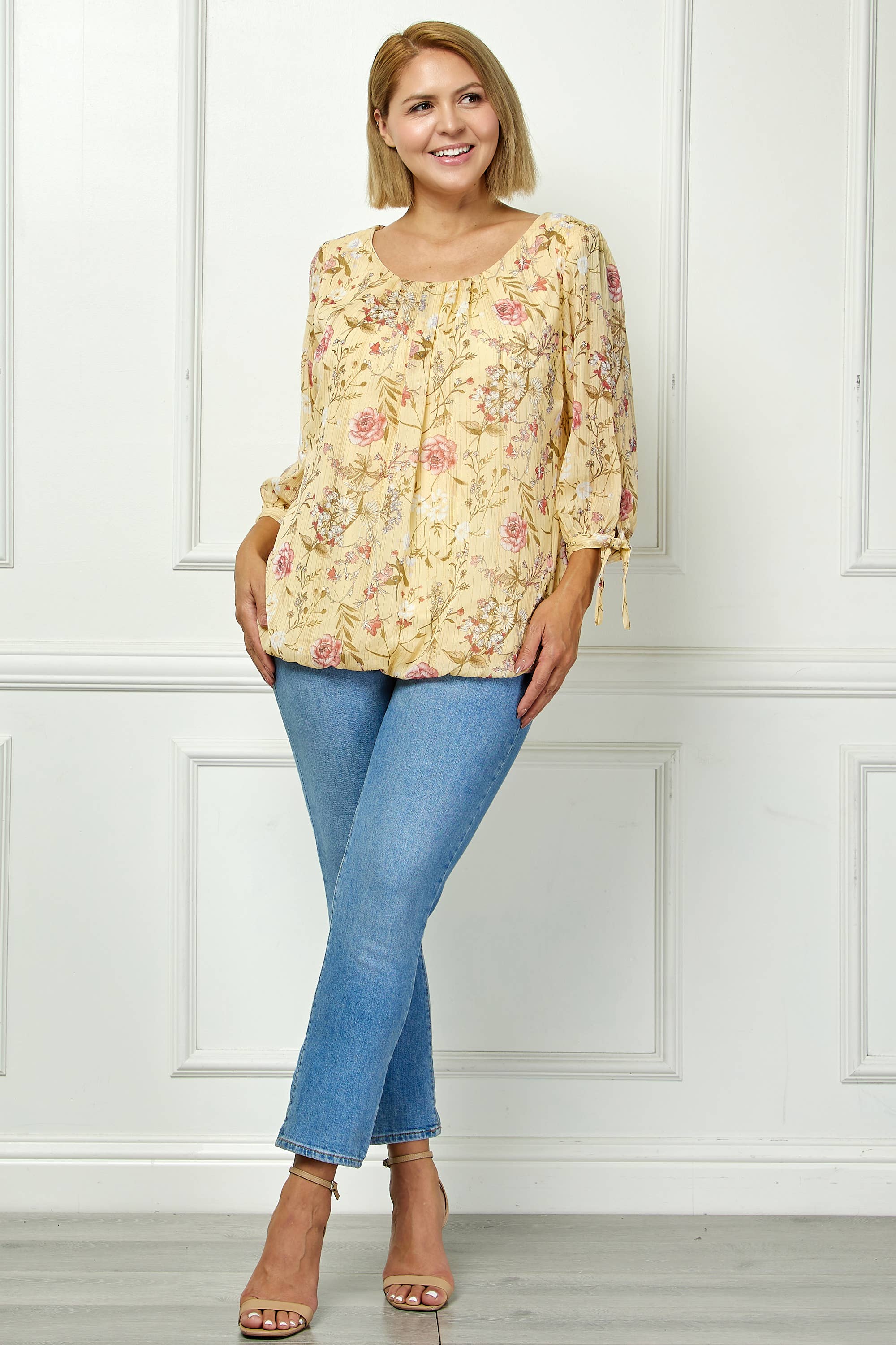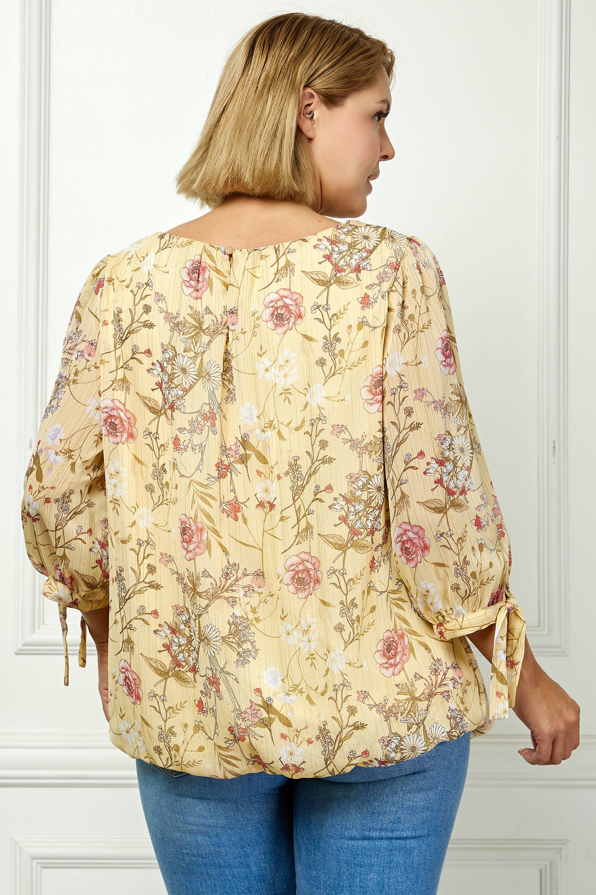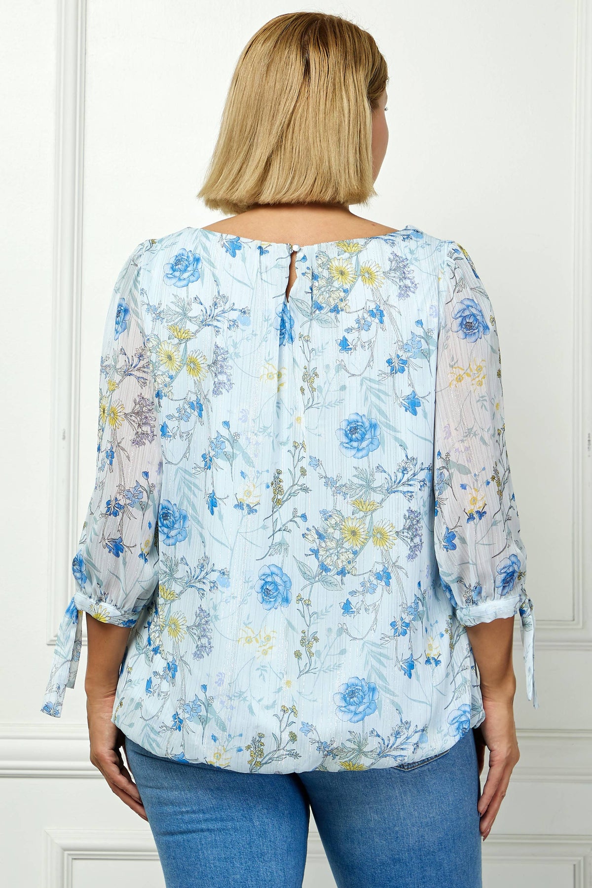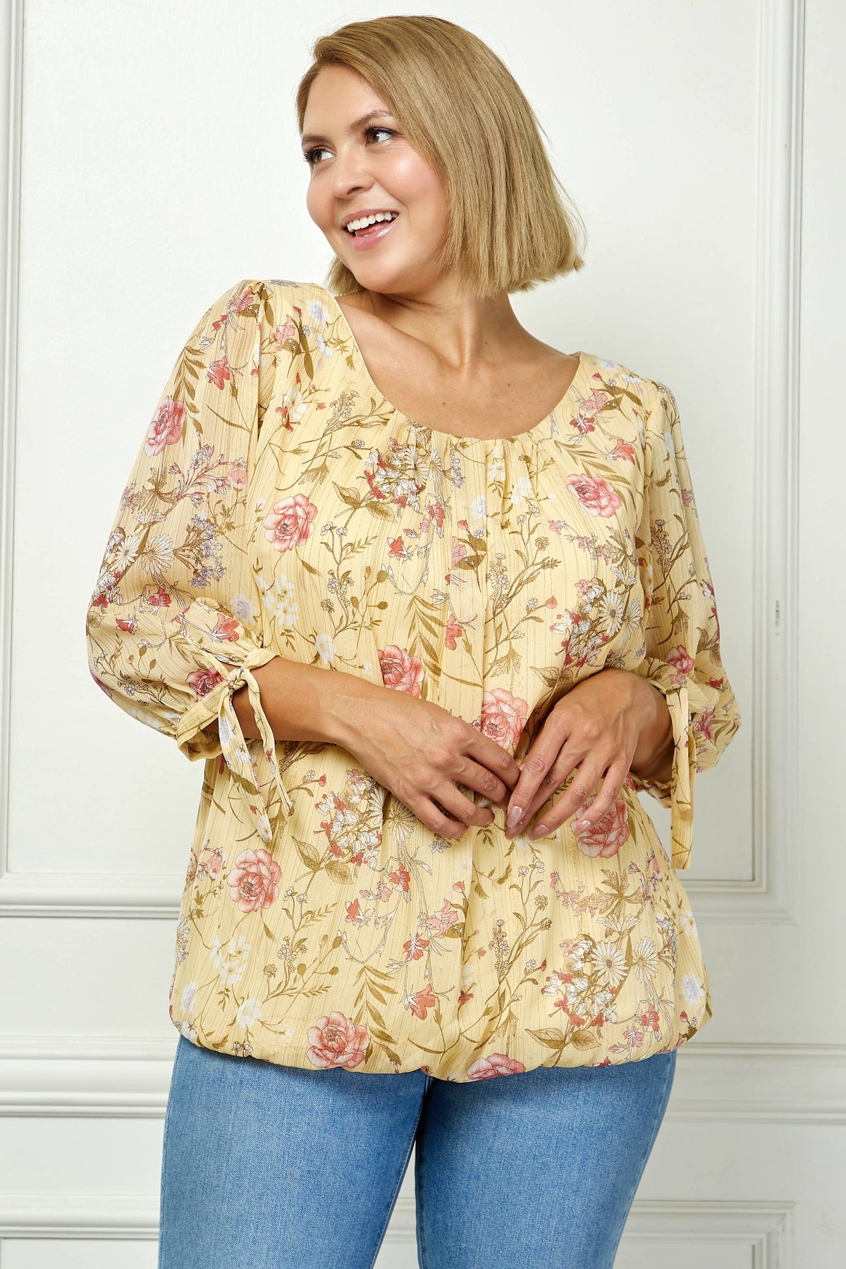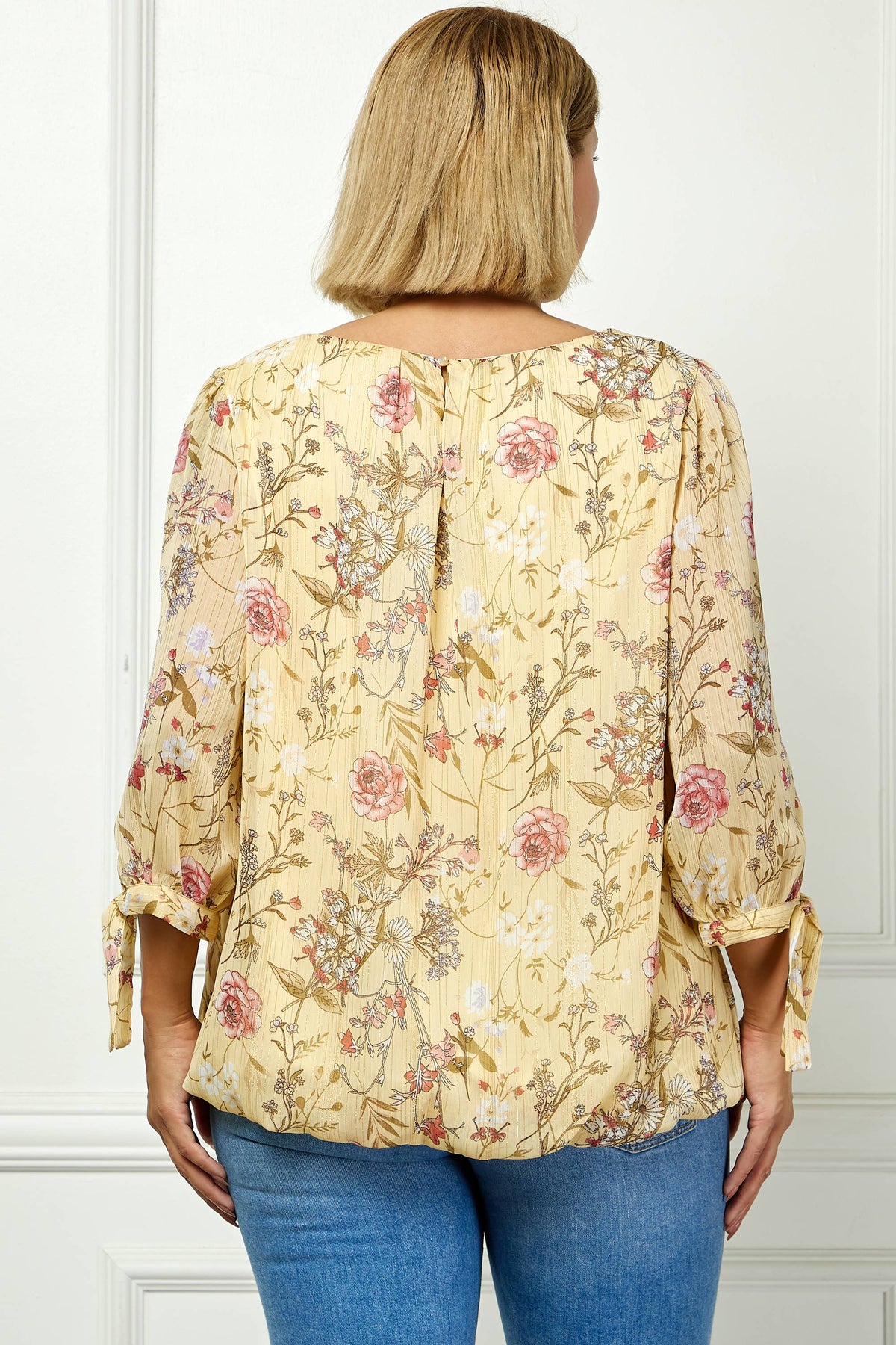 Lightweight chiffon blouse with a soft variegated stripe texture and subtle lurex shimmer. Relaxed silhouette with gathered scoop neckline and 3/4 length sleeves with adjustable self-tie details. Designed for plus sizes to offer comfortable coverage while maintaining an airy, feminine drape. Perfect for weddings, brunches, special occasions, or polished everyday and office styling.