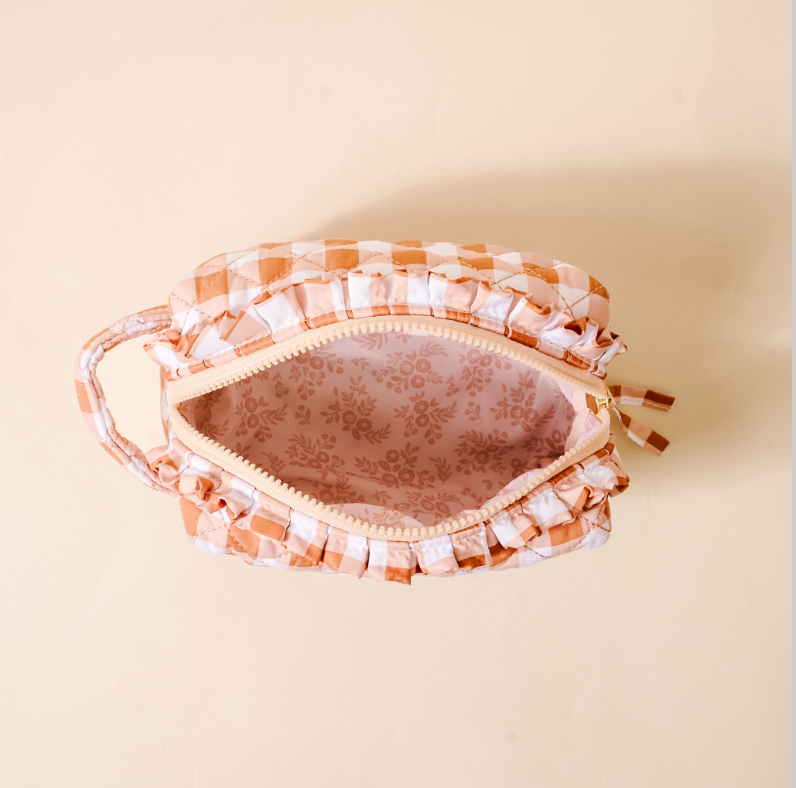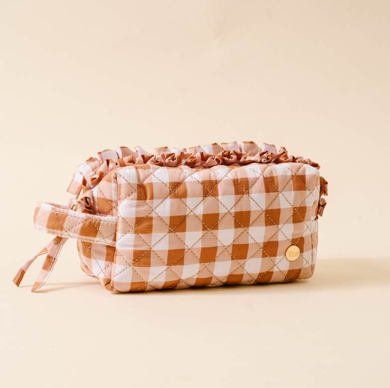 Keep your essentials organized with this Forest Green Quilted Cosmetic Pouch! Crafted from soft quilted fabric, this pouch features a small handle for easy carrying and gold zipper hardware for a touch of elegance. The signature darling wipeable interior lining ensures that your items stay neat and easy to access. It's the perfect size for your everyday makeup routine, whether you're at home or on the go.