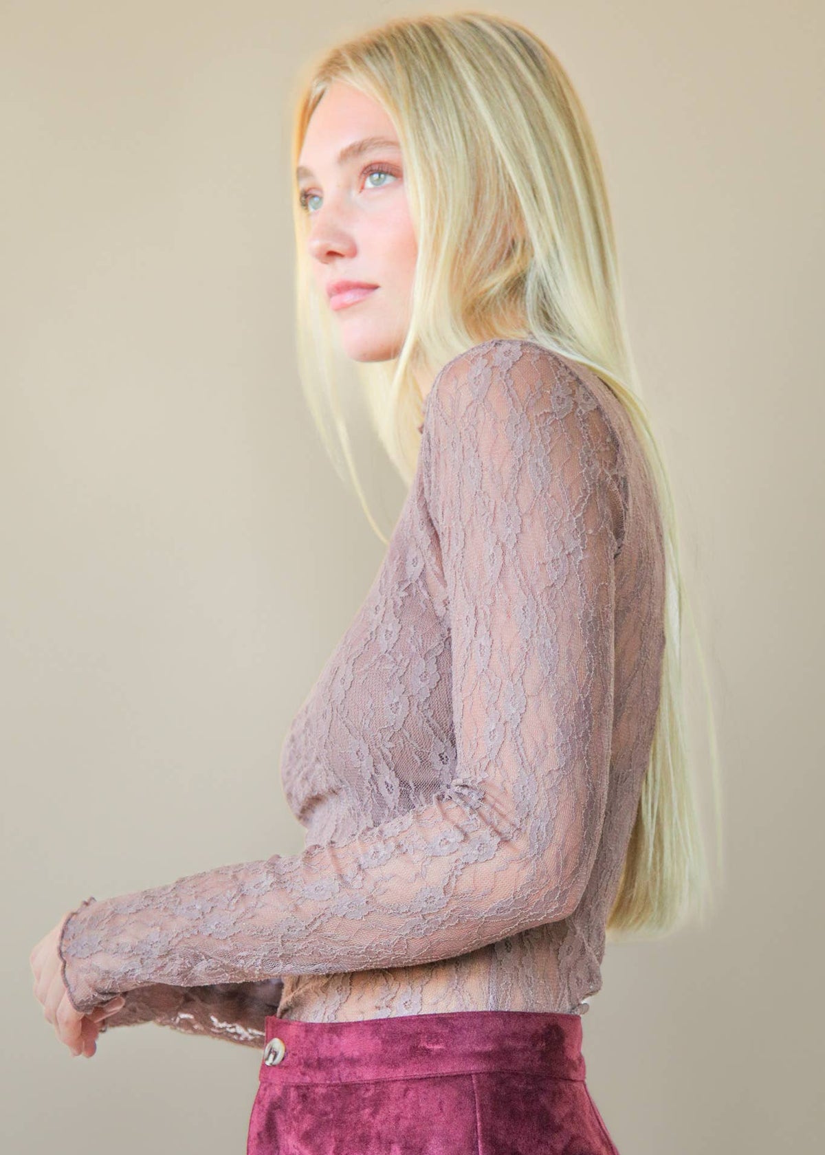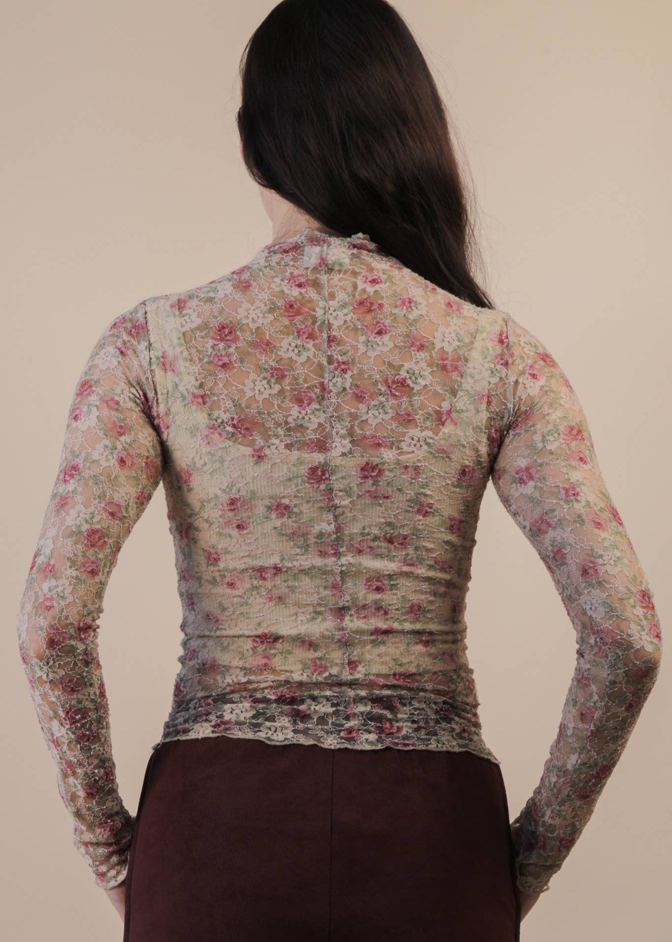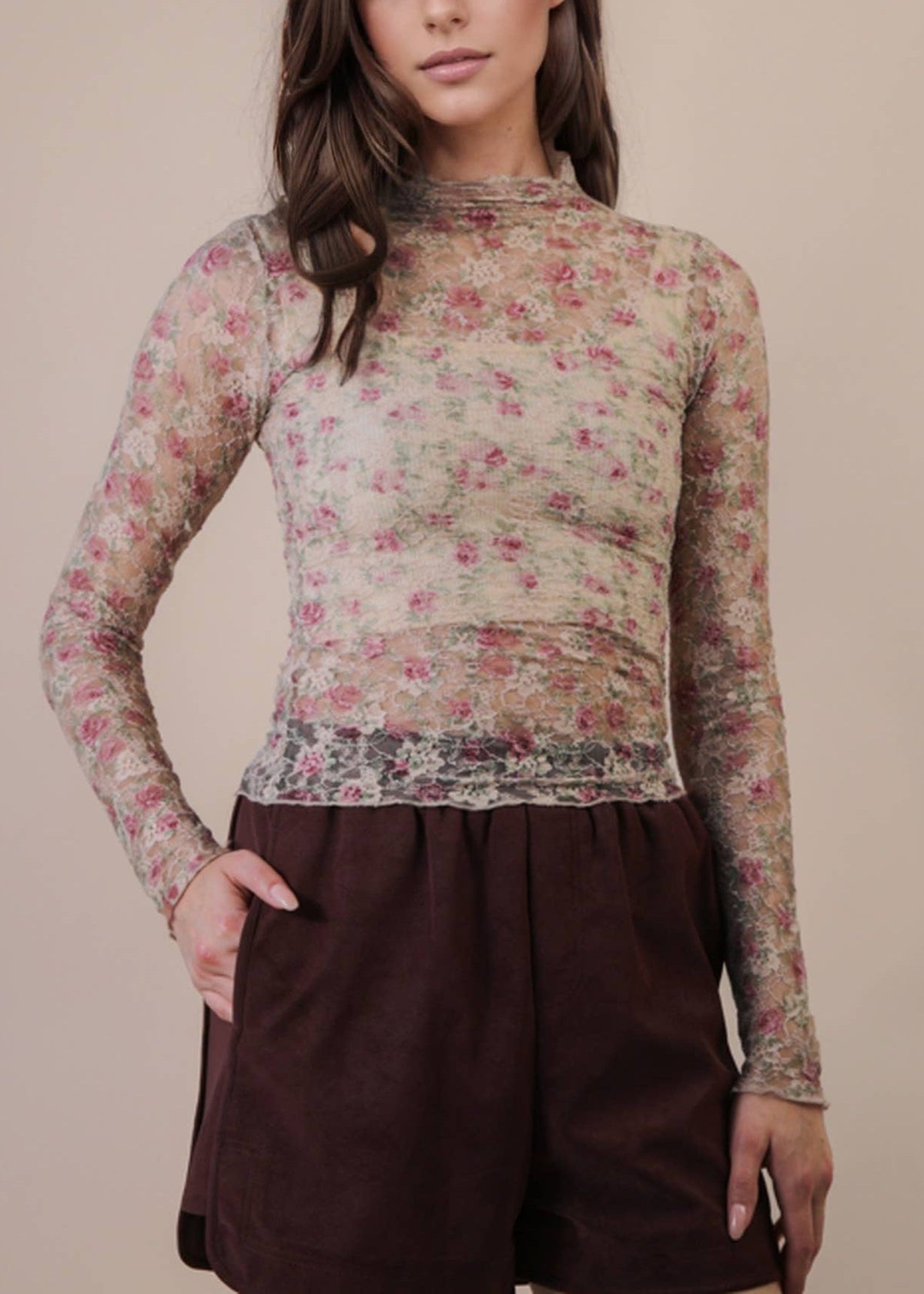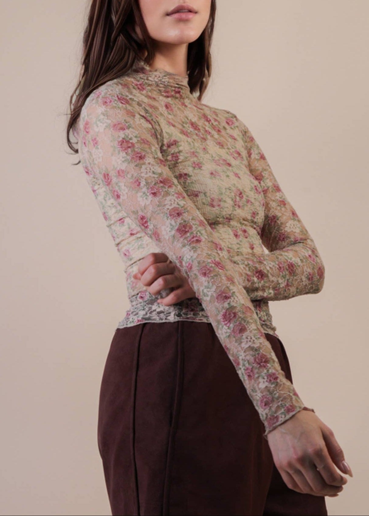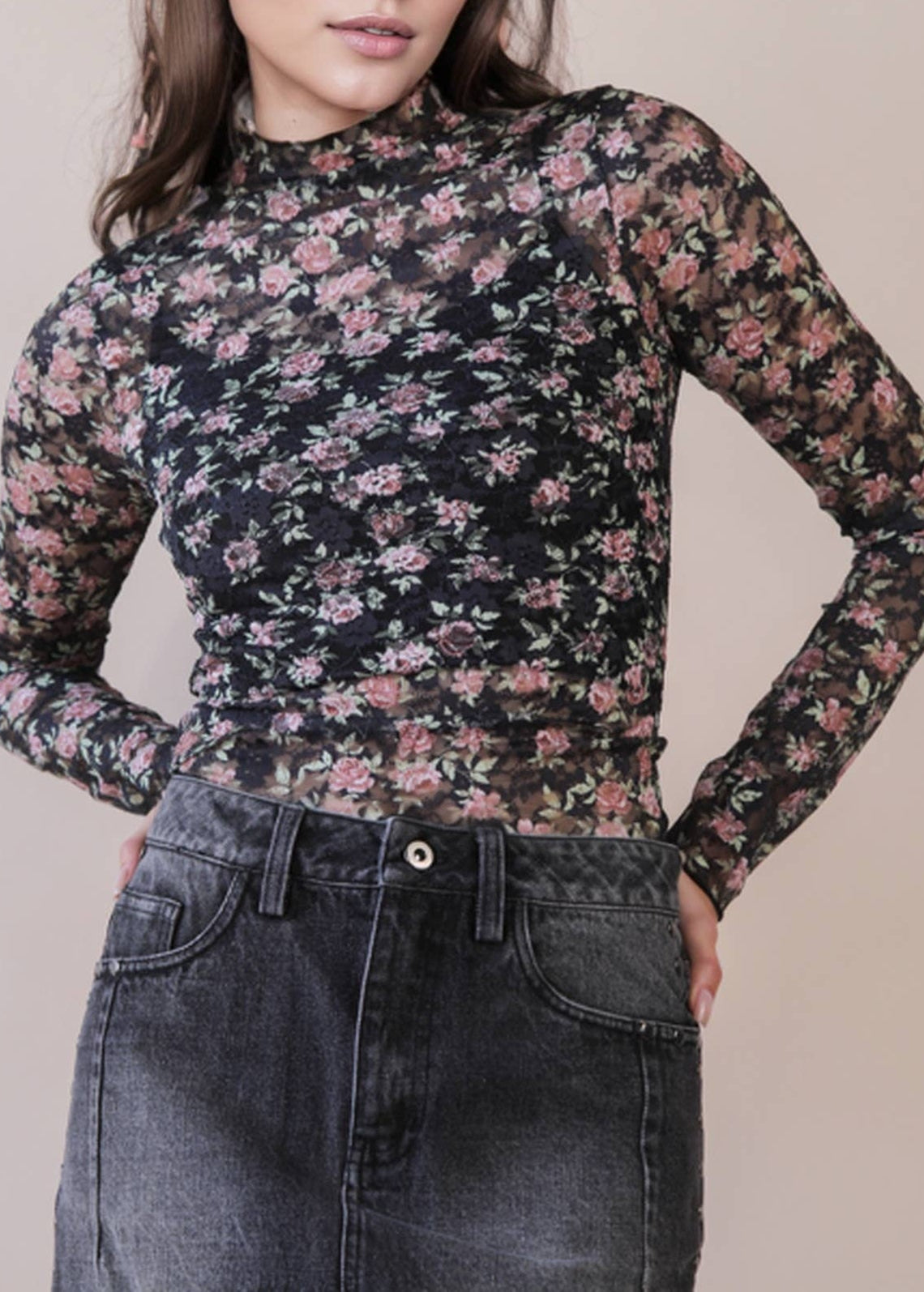 This high-neck fitted top features a delicate sheer mesh design with a beautiful floral lace knit pattern. Its long sleeves and solid, lightweight fabric make it an elegant layering piece that adds subtle texture and charm to any outfit. Perfect for dressing up or down while keeping a graceful and comfortable fit.