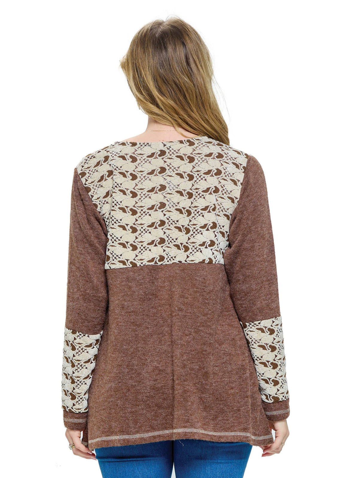 This easy-fit pullover blends boho chic and gypsy groovy vibes, featuring a unique patchwork design accented by velvet lace appliqué and color contrast details. Its flattering V-neck, long sleeves, and exposed contrast stitch on the hem add subtle sophistication to everyday wear.