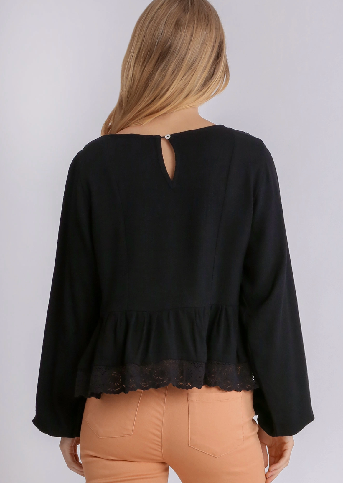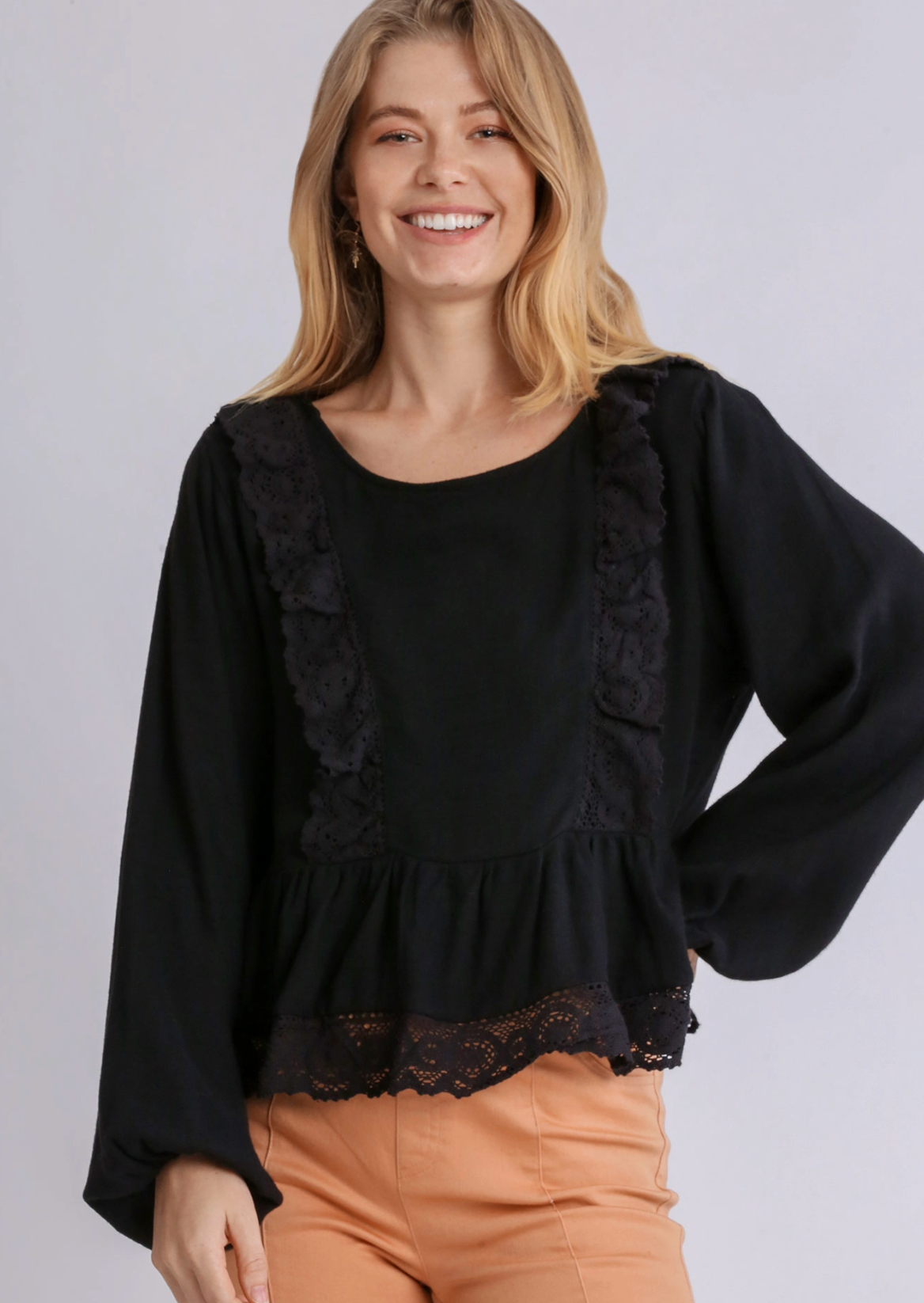 This linen blend ruffled long sleeve peplum top combines comfort and charm effortlessly. The delicate lace trim adds a touch of elegance, while the keyhole back detail offers a subtle, graceful flair. Its breathable fabric and flattering silhouette make it a perfect choice for everyday wear or special occasions, providing a soft and stylish addition to your wardrobe.