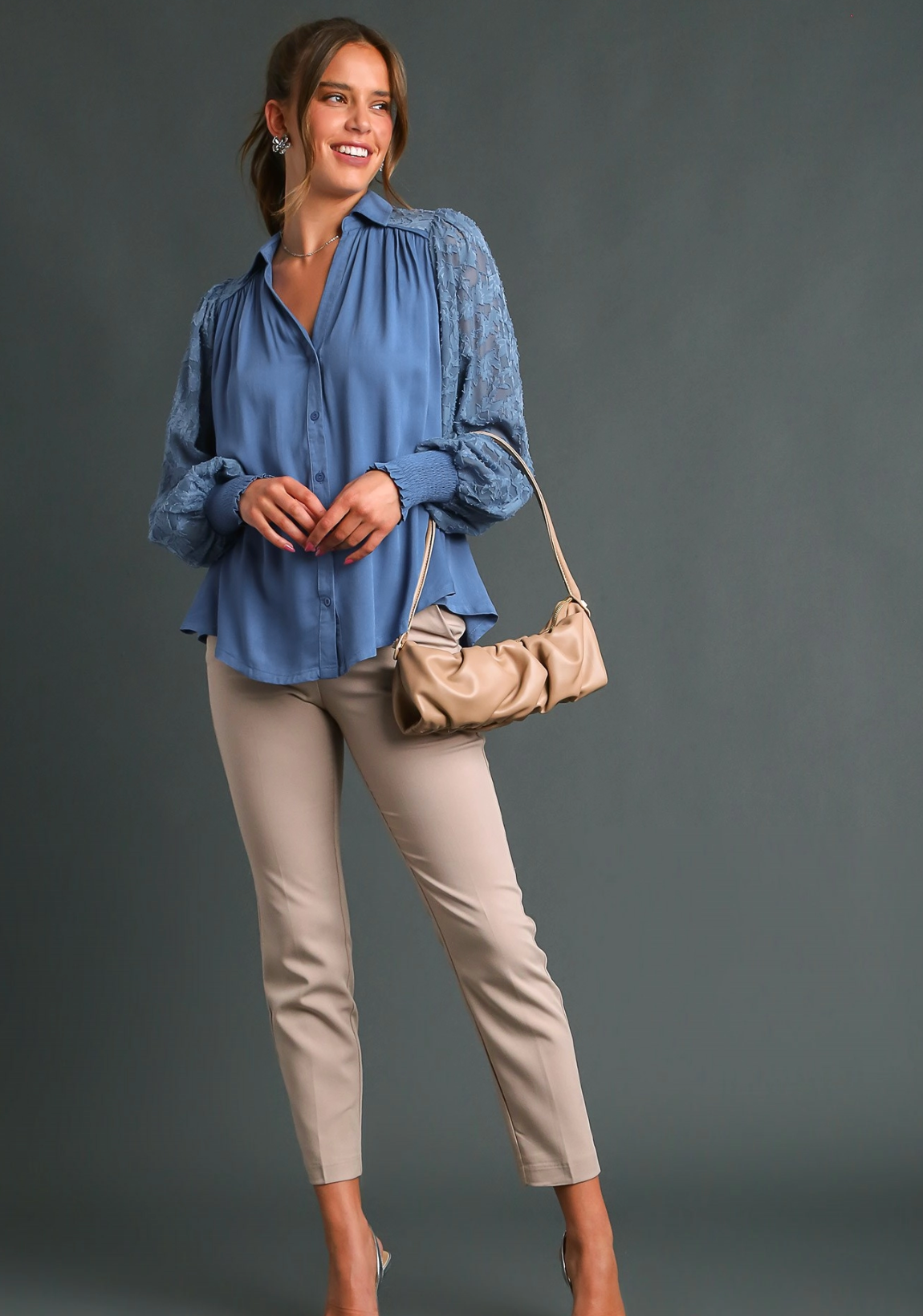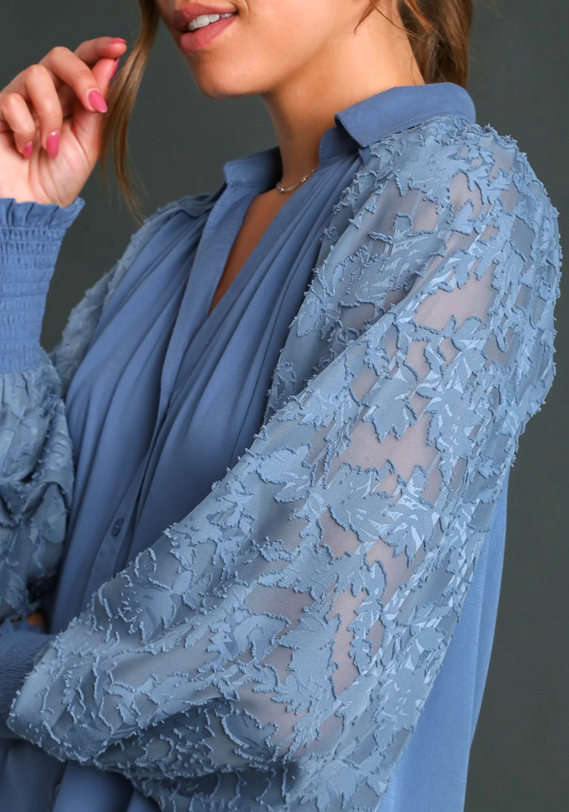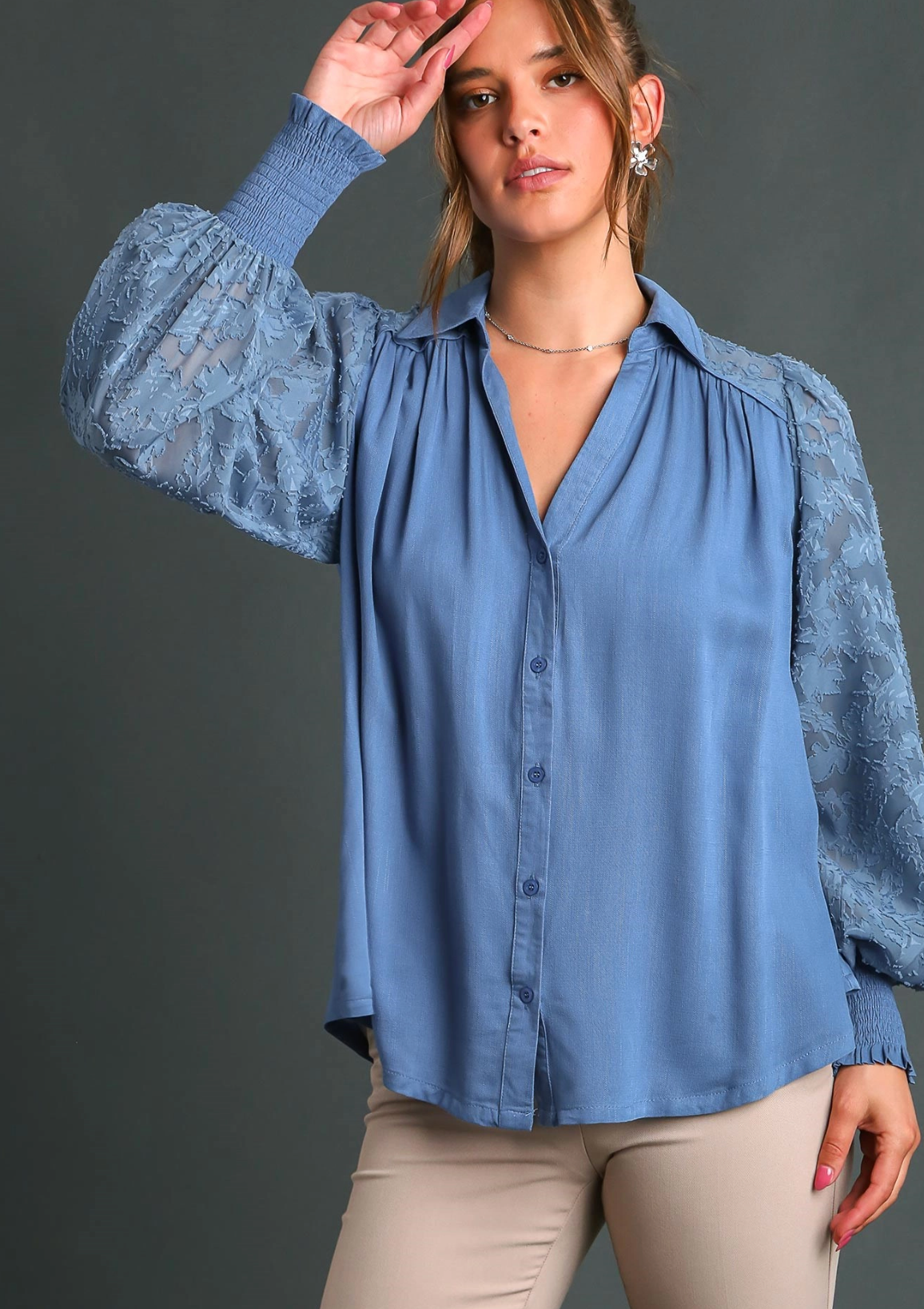 This Floral Jacquard Button Down combines elegant texture with fresh style. Featuring puff sleeves and a flattering v-neck, it adds a touch of romance to any outfit. The contrast detailing and button-down front create a chic, modern look perfect for dressing up or down with ease.